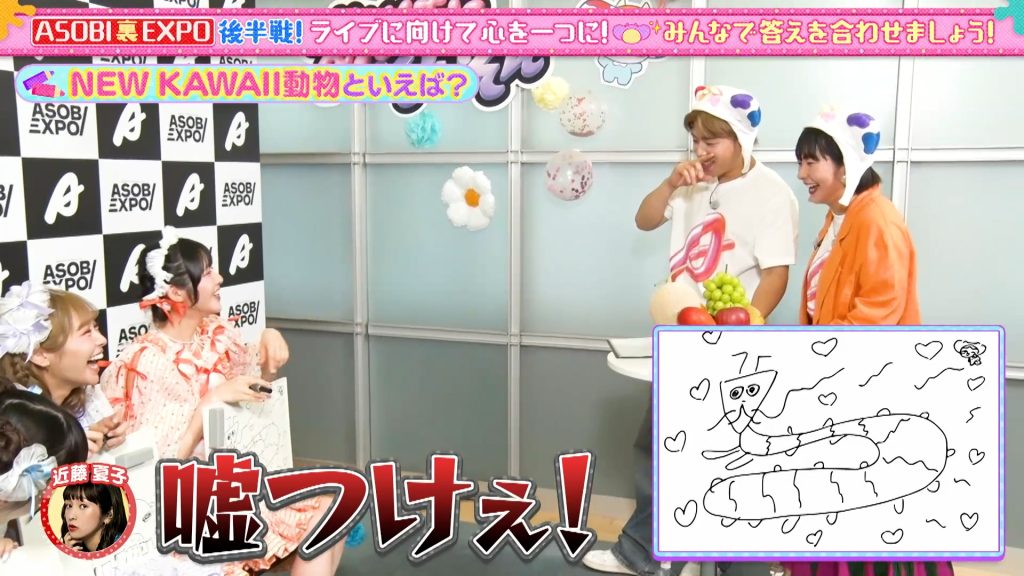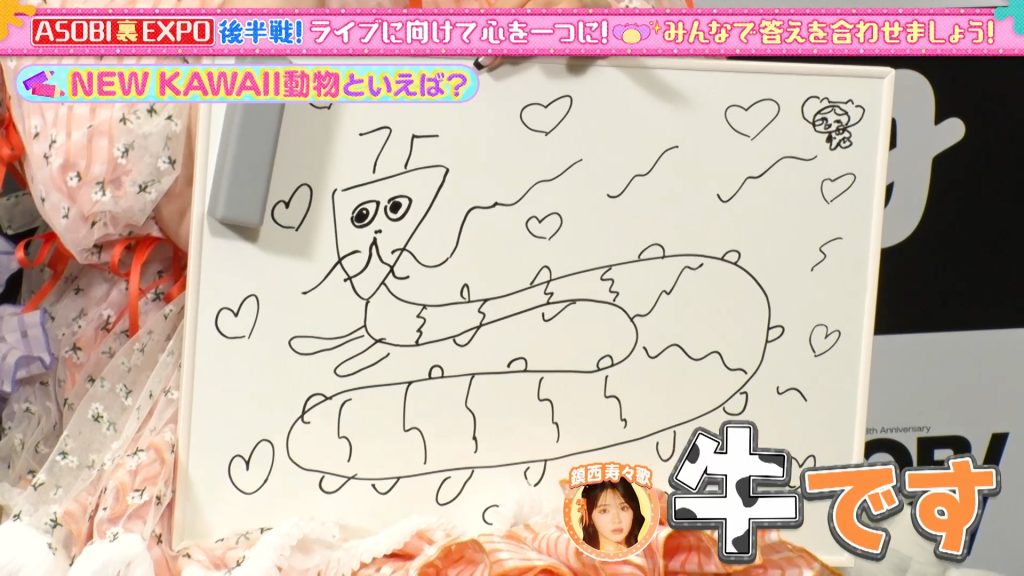 続いてのコーナーは、「〇〇といえば?」というお題に対して、5人の回答を一致させる「ライブに向けて心を一つに!みんなで答えを合わせましょう」。お題「NEW KAWAII動物といえば?」にイラストで回答することになったのだが、ここで鎮西の絵心のなさが明らかに。