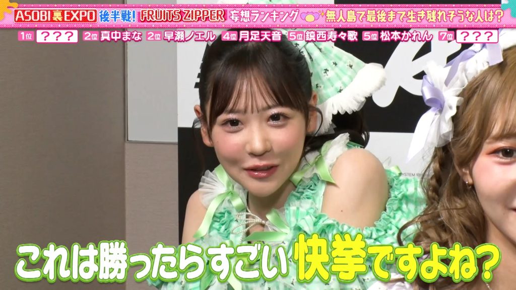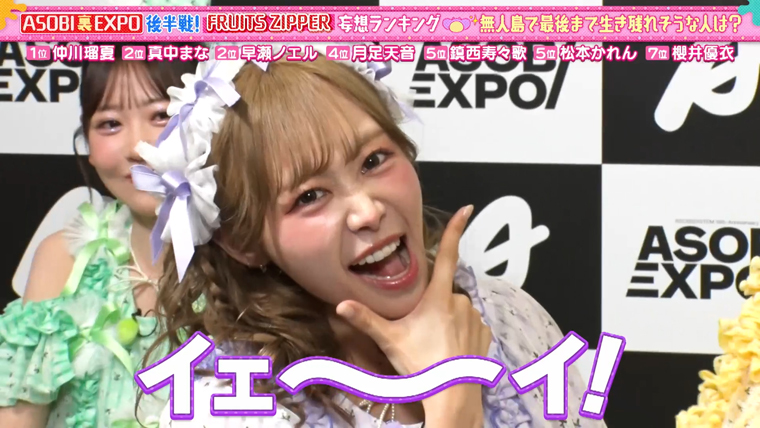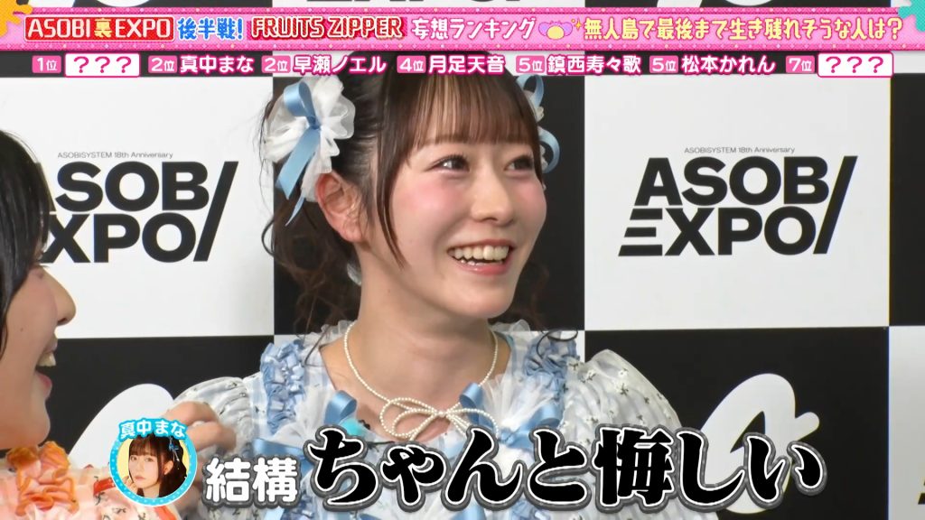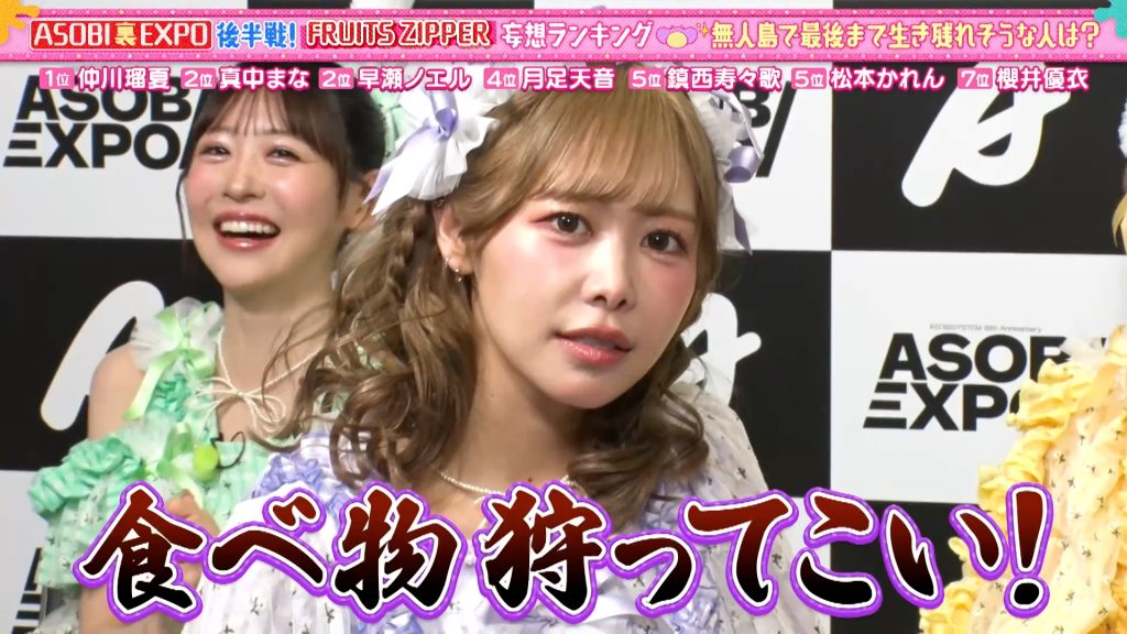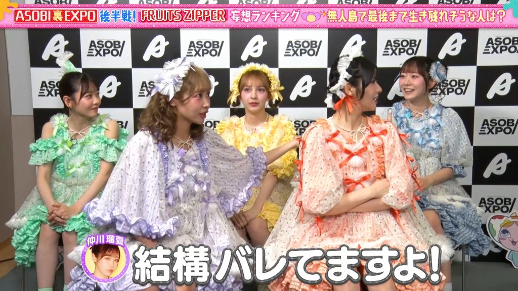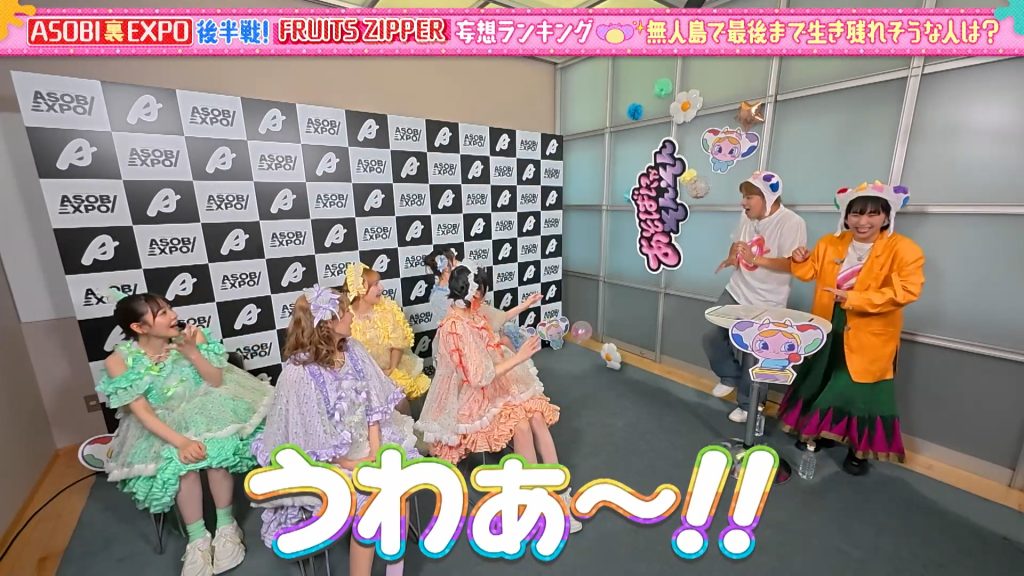 前回から「あそばにゃそんそん」では、ライブ直前のアーティストを直撃し、新たな一面を深堀りするコーナー「ASOBI裏EXPO」を放送中。FRUITS ZIPPERの櫻井優衣、鎮西寿々歌、真中まな、仲川瑠夏、早瀬ノエルの5人を迎えて「原宿50人に聞いたFRUITS ZIPPER妄想ランキング」という企画を実施中。