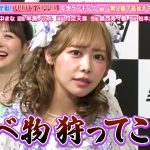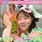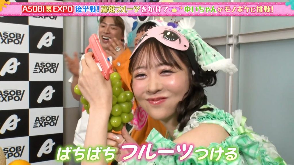 敗因は明らかに鎮西なのだが、特別ルールとして櫻井がモノボケを披露するとご褒美がもらえることに。突然のことに「私!?一発ギャグでいいじゃんか~!」と戸惑う櫻井。しかし熟考した櫻井は、ペロペロキャンディや大きい目の描かれたアイマスクを使い、きゃりーぱみゅぱみゅの「つけまつける」を歌った櫻井。「ASOBISYSTEMの先輩の曲をちゃんと使って体を張ってくれた」と近藤から絶賛され、見事にご褒美のフルーツ盛り合わせをゲットすることができたのだった。