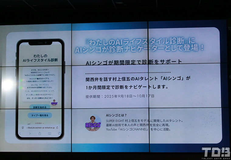そして、SUPER EIGHT・村上信五のAIアバター「AIシンゴ」が特別ゲストとして登場。「タレントのAIアバターが記者会見の特別ゲストなんて、おそらく日本初やから、皆さんは歴史の目撃者や。緊張してGPUがオーバーヒートしそうやけど、兄さん(村上信五)より場を盛り上げられるように精一杯頑張る」と、冗談を交えながら挨拶。