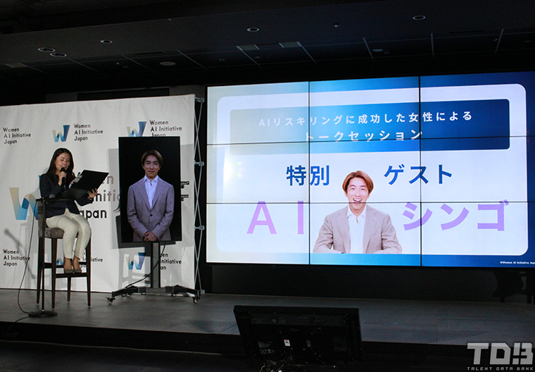 AIチャレンジに成功した女性の体験談を語るトークセッションでは、株式会社サイバーエージェント 執行役員 AIオペレーション室 室長の上野千紘氏、フリーランス・QAエンジニアの平下ひかる氏、Cynthialy株式会社の秋元かおる氏が登場し、AIシンゴが「多くの女性がAIを学ぼうとした時に、どうやって学べば良いか分からないなどの不安が多いというデータがあるんやけど、皆さんはどうやった?」「普段、皆さんは日常的にどんな風にAIを活用しているんやろうか?」と問いかける場面もあった。