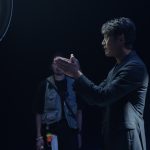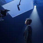 青いピンライトが照らされる中、実際に書類をたくさん並べた素敵なセットでの撮影でした。書類の間を歩くシーンでは、せっかくスタッフの皆さんがキレイに並べてくれた書類を、間違って踏んで乱さないように気を使っていました。