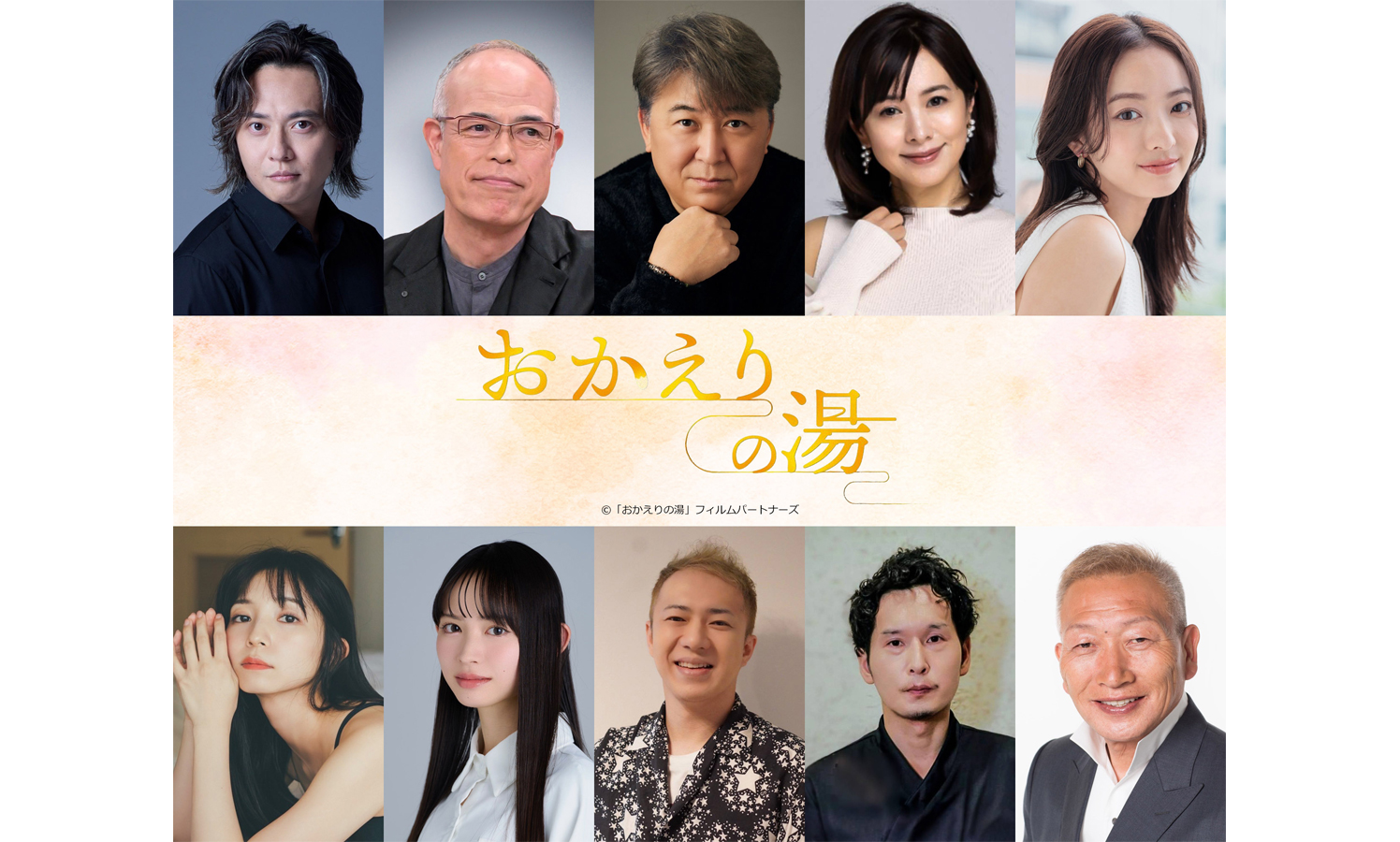 おちょこちょいな送迎担当・鈴木光役には、舞台「ハリー・ポッターと呪いの子」でロン・ウィーズリーを演じた石垣佑磨。温泉をいつも清潔に保つ清掃員・渡辺明役には、日本を代表するバイプレイヤー・田中要次。昔ながらの少し頑固な料理長・高橋修役には歌手・俳優として長年活躍する嶋大輔。少し気の強いフロント係・吉川さくら役は、変わらぬ明るいキャラクターで親しまれるさとう珠緒。マッサージ係・中村彩役には「ミス美しい20代コンテスト」グランプリを機に注目を集める川瀬莉子。変わった愛情表現するエステティシャン・松本香役には「蜜と毒~逆恨みの復讐」で連ドラ初主演を果たした入来茉里。温泉をSNSで発信する小林奈々役には、映画やドラマへの出演が続々と決定している新星・水瀬紗彩耶。他にもハニトラ梅木、友貴が脇を固める。そして、佐山の落語の師匠・お気楽亭最好役を伝説の漫才コンビ・ツービートのビートきよしが演じる。