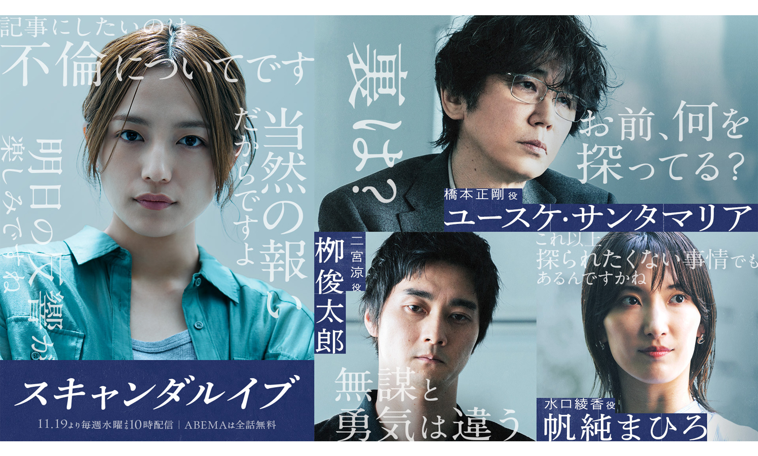 スキャンダルを巡る芸能事務所と週刊誌の“禁断の攻防戦”を描く、ABEMA新オリジナルドラマ『スキャンダルイブ』。誰しもどこか気になってしまう芸能界のスキャンダル。しかし、その裏側では、いったいどんな人たちの、どんなドラマが隠されているのか… 『スキャンダルイブ』は、一見華やかにみえる芸能界の裏側を舞台に、いまだかつて描かれることのなかったスキャンダルの裏側、そして芸能界の深い闇へと切り込んでいくサスペンスドラマ