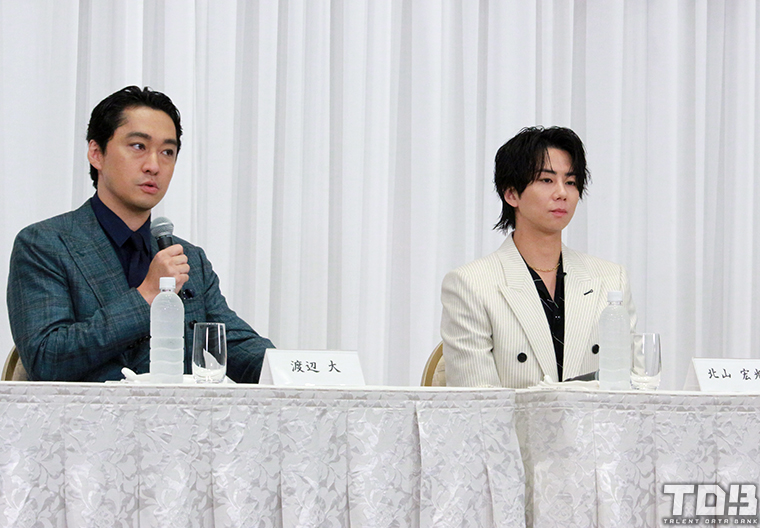 闇市の界隈に住む人々を診る町医者で、北山演じる松永を診ることとなる真田を演じる渡辺は「映画や前の舞台では(松永と真田は)親子のような感じだったんですけど、僕と北山くんは歳が1個しか違わないので、どちらかというと歳の離れた兄貴ぐらいな感じで関係性を作っていこうと思っています。真田が持っているファミリーの中に、松永も入ってこいよと、天使になれるんじゃないかなというようなことを意識して。エネルギッシュな真田に方向性を持っていって、それが非常にフィットしながら、ここ数日やっと光が見えてきて、この光で出口が見えるのか、模索しながらこれからやっていくんじゃないかなと思います」と、本作ならではの関係性を築きながら演じようとしており、北山の印象は「非常にクールでかっこいい松永をやっているところがあって、それは大病を患っている怖さの裏返しというところもあるので。明と暗がこの作品には出てくるので、僕はとびきりの明で引き摺り込んでやろうと、常に意識しています」と語る。