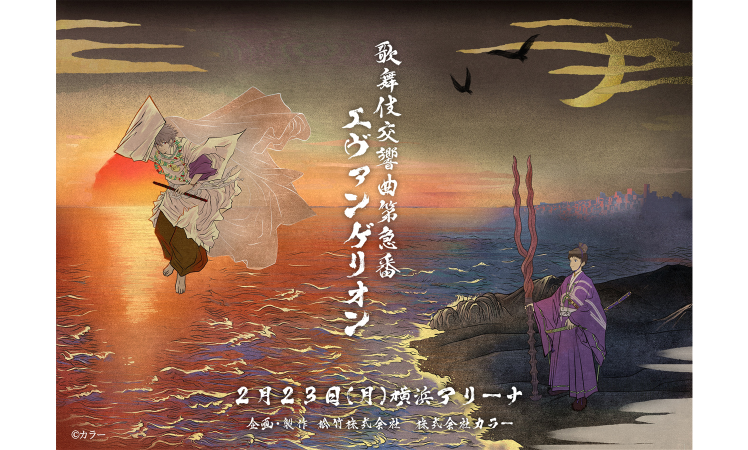 2026年2月に横浜アリーナにて開催されるシリーズ初となるフェスイベント「EVANGELION:30+; 30th ANNIVERSARY OF EVANGELION」が開催。『歌舞伎交響曲第急番 エヴァンゲリオン』は本フェスイベント最終日・3日目となる2月23日(月・祝)の「STAGE AREA」での公演となる。今回初解禁された本公演のキービジュアルでは夕日に照らされ海の上に白装束で浮かぶ渚カヲルと、砂浜に佇み大型の槍を持つ碇シンジが印象的な和テイストのビジュアルになっている。