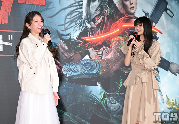 女性アンドロイド・ティア風の衣装に身を包んで登場した松村、エル・ファニングの大ファンであるが『プレデター』自体を観ることは初めてだったようで「私、初心者なんですけど想像以上にハートフルでびっくりしました。戦闘シーンはもちろんすごい大迫力でかっこいいシーンもあるんですけど、ちゃんと心と心の会話というか感情がどんどん生まれていってる感じがすごい素敵で本当に最後も心があったかくなって帰りました」と本作の魅力を語った。