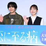本作で3年ぶりの共演となる2人、本作ではW主演として完成披露から毎週様々な宣伝活動で顔を合わせてきたということで改めてお互いの印象を聞かれると山田は「何を言っても受け止めてくださるのですごく舞台挨拶とかでもほんとに安心感がありました」とべた褒め、続けて「あとは衣装が可愛かったです!今日長尾くん何着てるんだろうって楽しみにしてました」と語ると、長尾も「僕も杏奈ちゃんの衣装すごいいつも可愛いなと思って見てましたね。僕がこういう感じですごい話す中でしっかりとまとめてしっかりとしたことを言ってくれるので内容薄そうな話をちゃんと締めてくれる感じがあるのでそこは頼りになってます」と信頼を寄せる。すると山田は「西に行くにつれてラフになってる感じ、ホームに近づいていってるのを感じてました(笑)」と長尾の生態を暴露、長尾は「大阪に近づけば近づくほど安心感はやっぱりあります」と笑顔をみせた。