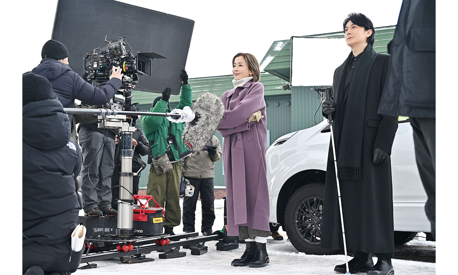 一方、映画の舞台となる北海道の地で撮影されたのは、皆実と彼の初恋の人・ナギサが再会するシーン。謎の組織による襲撃から逃れてきたナギサは、皆実に自身と娘の二ナの保護を求め、握手を交わします。短いやり取りの中で、言葉にせずとも互いへの想いが感じられる、どこか切なくも深みのあるシーンとなっている。福山と宮沢は本作が初共演ですが、ともに長年役者としてトップを走ってきたベテラン同士、空き時間の会話も楽しんでいた様子。皆実とナギサの物語、そして今まで語られなかった皆実の過去にも、ますます注目が集まる。
