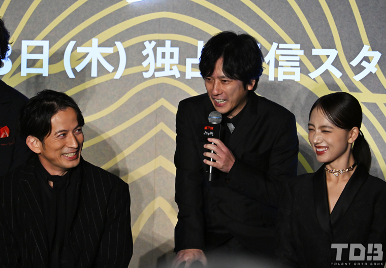 さらに現場での裏話について「(伊藤)英明さんがずっとほぼ裸」と言及した二宮。「撮ってる時期は寒かったんですけど、待ってる最中もほぼ裸でなんか英語の勉強してて(笑)後ろから見てたんですけど無骨で英語ずっと言ってる。それはもうすごいなと思った」と暴露すると、伊藤は「世界に羽ばたく作品なので英語でインタビューに答えられるように」と説明して会場を笑わせる。続けて他のキャストに対しても二宮は「それぞれの皆さんの居様がちゃんと役が入りきった状態で、特に僕は1話最初のみんなが集まってるところのシーンだったので、上から見させていただいてみんなが本気で現場に毎日来てるんだなって感じました」と出演キャストの作品にかける想いを称賛していた。