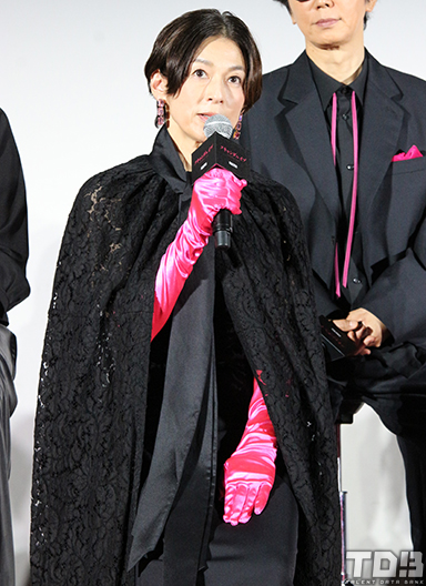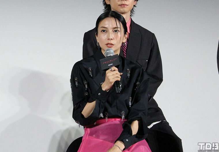 初回配信を翌日に控えて行われた放送直前プレミアイベントには、柴咲、川口をはじめとした総勢12名のキャストが一同に会し、黒とショッキングピンクのコーデで登場した。