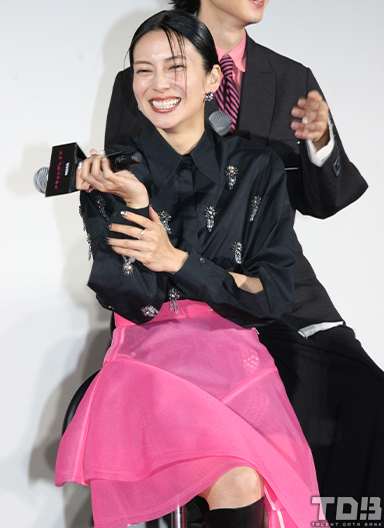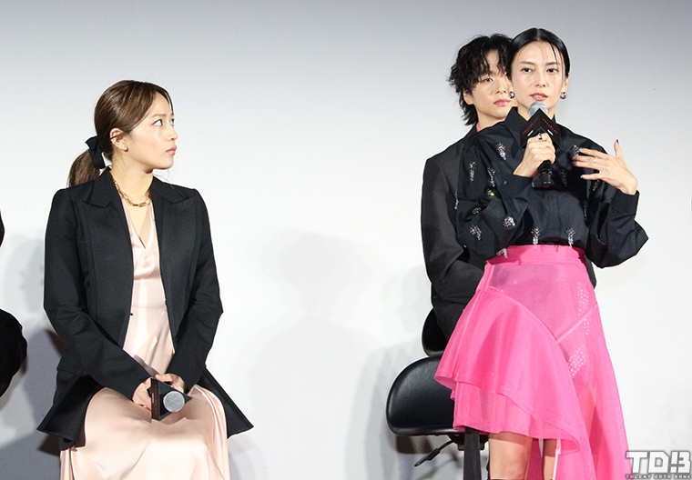 初回配信を翌日に控えて行われた放送直前プレミアイベントには、柴咲、川口をはじめとした総勢12名のキャストが一同に会し、黒とショッキングピンクのコーデで登場した。