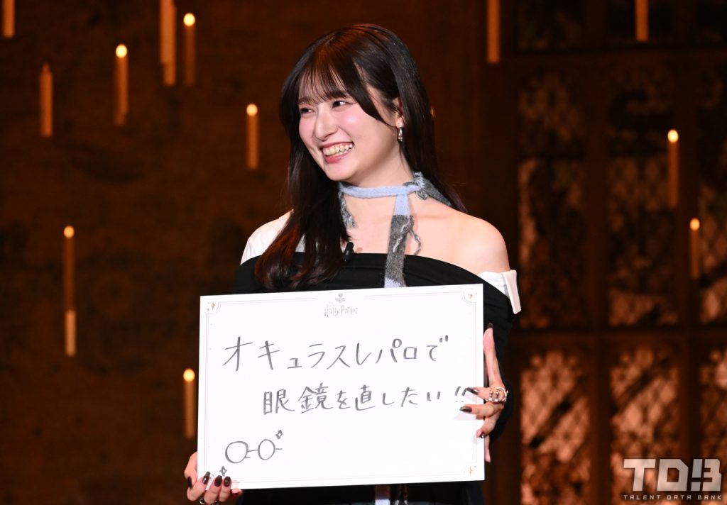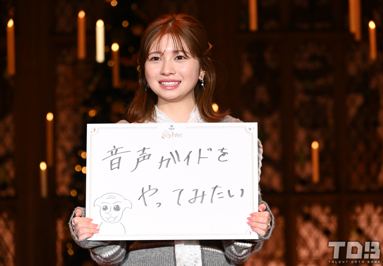 アンバサダーとして挑戦したいことを聞かれた吉川は「オキュラスレパロで眼鏡を直したい!」と映画にも出てきた魔法を交えた回答。先日お気に入りの眼鏡を壊してしまったそうで「汽車の中で眼鏡を直すシーンの魔法なんですけども、先日眼鏡をハリーの眼鏡のごとく割ってしまいまして…なかなか直しに行く機会がなくて1個前に使ってた眼鏡を最近は使っているんですね。なので、オキュラスレパロで直せたらなんといいことかと思ったのでこのやりたいこと書かせていただきました」と説明した。一方の桜田は「すごく現実的なもの」と切り出し、「音声ガイドをやってみたい」とドビーのイラストも描かれたフリップを掲げる。「音声ガイドっていうものを今までやったことがないんですけど、これを機にアンバサダーとしてお仕事させていただくとしたらというので夢が詰まった音声ガイドというものを熱を込めながらぜひやってみたい」と意欲をみせると、吉川も「共にいいですか?」と挙手。桜田は「スタジオツアーを盛り上げるべく一緒に音声ガイドをやってみる」と目標を変えるとふたりで声をそろえて「よろしくお願いします!」とアピールしていた。