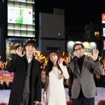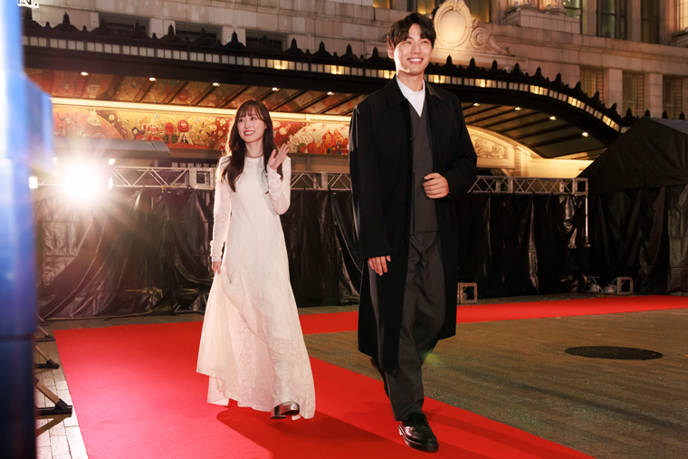 会場となったなんば広場は、かつて道路やタクシー待機場だった場所が2年前にリニューアルオープン。“映画興行発祥の地・なんば”として文化発信の拠点となるエリアとして進化してきた。「なんば」は日本の映画興行発祥の地で、記念碑もあるなど映画と深いつながりがある場所。映画と街を一緒に盛り上げ、来場者に心が躍るような体験を提供したいという思いで、今回のイベントが開催された。イベント開始前から会場にはスピッツ「楓」が流れ、来場者にはペンライトが配布されるなど、冬の訪れと映画の世界観を感じさせる演出でムードを高めた。