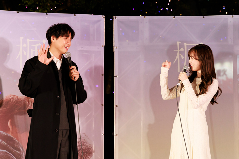 イベントの後半には、来場者限定の“10秒撮影タイム”がサプライズで実施され、会場からは大きな歓声が上がった。続いて行われたライトアップ点灯式では、福士・福原・行定監督によって“プレゼントボックス型イルミネーションモニュメント”が点灯。来場者も「楓色」のペンライトを掲げ、広場全体が“楓色”に染まり、登壇者と会場が一体となった美しい光景が広がった。