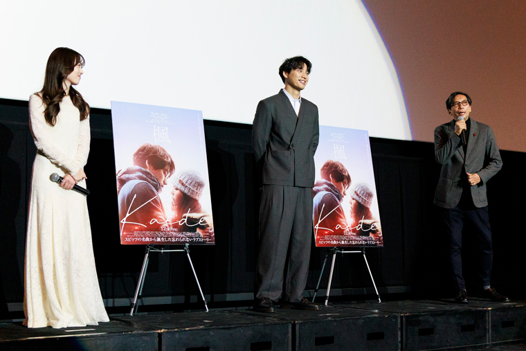 そして集まった観客に向けて、監督は「12月19日公開です。冬に観ると心が温まる作品で、スピッツをはじめ4曲の音楽がリフレインします。劇場の素晴らしい音響でぜひ楽しんでください」、福原は「亜子と涼が大切な人を失った後、どう自分と向き合うか注目してほしい。観終わったあと、大切な人をもっと大切にしたくなる作品です」、福士は「劇中で4回『楓』が流れ、それぞれ違う色味があります。劇場で聴くと曲の新しい表情が感じられると思います」と締めくくった。