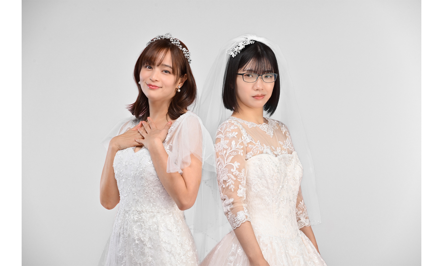 また、赤木ユカ(加藤ローサ)と青島智恵子(福田麻貴)の役写真も一挙解禁。ウエディングドレス姿の2ショットは、夢見るような笑顔の赤木と、冷静な真顔を崩さない青島という、二人の対照的な表情が印象的な一枚。あわせて、赤木の「勝負デート服」と青島の「機能性オフィス服」というソロカットも公開。日常の装いからも見てとれる、正反対な二人のキャラクター性に注目。