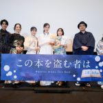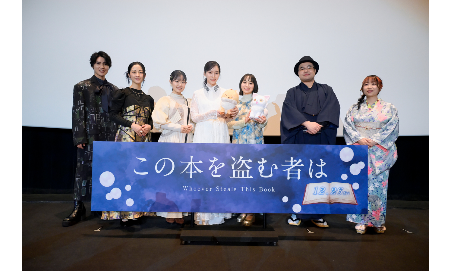 冒頭の挨拶で、本の街・読⻑町の巨⼤な書庫「御倉館」を管理する⼀家に⽣まれた本作の主⼈公、御倉深冬役の片岡は「足を運んでいただきありがとうございます」とニッコリ。深冬の前に突然現れた謎の犬耳少⼥、真⽩役の田牧は「お忙しい中お越しくださりありがとうございます。よろしくお願いいたします」と拍手に包まれた会場を見渡し笑顔を見せる。深冬の叔⺟、御倉ひるね役の東山は「12月26日から公開の本作をいち早く観ていただけるということで、とてもうれしいです。楽しんでいってください!」と上映前の観客に呼びかける。本好きな⾃称・⾵来坊の与謝野蛍⼦役の伊藤は「たくさんのみなさんに楽しんでいただけるのがうれしいです」と微笑み、読⻑商店街にある新刊書店「春⽥書店」で働く⼤学⽣、春⽥貴⽂役の土屋は「上映前のイベントということで、口を滑らさないように頑張ります!」と笑いを誘う。本作を⼿掛けた、福岡監督は着物にハットをあわせた衣装で、キャラクターデザイン&作画監督を務めた黒澤は、華やかな着物姿で元気に挨拶し、大きな拍手を浴びた。