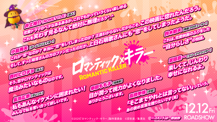 公開を目前に、全国をロマンティックに染めるべく動いている本作だが、なんと芸能界や漫画界・アニメ界にもロマンティックが浸透し始めている。一足先に本作を鑑賞した著名人たちから甘くロマンティックな賛コメントが到着した。