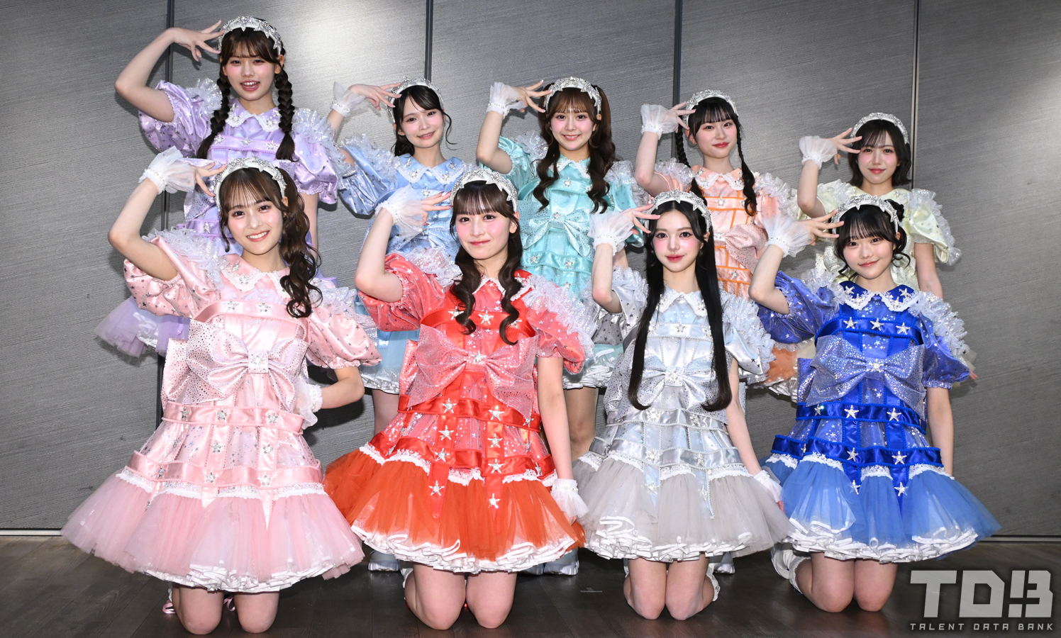 取材会にはイベントでお披露目されたMORE STARの新井心菜、遠藤まりん、笹原なな花、鈴木花梨、高梨ゆな、中山こはく、萩田そら、森田あみ、山本るしあに加えて、先輩グループのFRUITS ZIPPERから鎮西寿々歌、櫻井優衣、真中まな、CANDY TUNEから立花琴未、桐原美月が出席した。