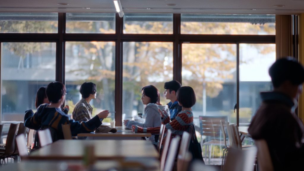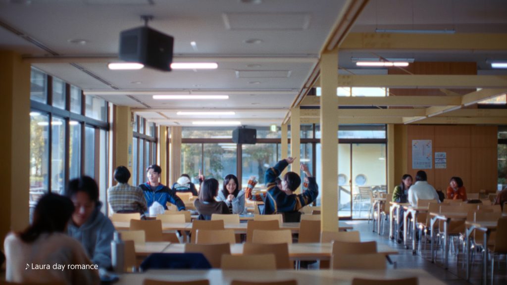 続いて、CM撮影の舞台は、とある大学の学食。スキーウェアから一転、パーカー姿のカジュアルな大学生スタイルで登場した上坂さん。キャンパス内を歩く様子は、まるで本物の学生のよう。CMでは、上坂さんのセリフはないものの「表情と目線でせつなさとときめきを伝えてほしい」という監督のオーダーに応え、細やかな表情で感情を表現していきます。テーブルを囲む男女6人のキャストは、初対面ながら和気あいあい。自然な会話と笑いがあふれる現場に「いいね!」と監督の声も弾みます。好きな人が最後の思い出となるスキー旅行に参加するのかどうか——。あきらめ、落胆、そしてうれしさが入り混じる、複雑なヒロインの感情を、上坂さんはセリフなしで見事に表現。憂いを帯びたまなざしがとても印象的でした。監督からは「悲しいだけでなく、喜びの瞬間も」と細かなニュアンスの指示が入り、上坂さんはわずかな口元の動きでその感情を演じ分けます。さらには「歯が見えるくらい、思わず笑ってしまう感じも!」というリクエストにもすぐに対応。監督からは「めっちゃよかった!」と大絶賛。共演者たちからも歓声が上がり、上坂さんも照れ笑いを浮かべていました。撮影後には、編集したばかりのCM映像を全員でモニター前に集まって鑑賞。どんな仕上がりのCMになったのか、ぜひキャンペーンサイト、TVCMでお確かめください。