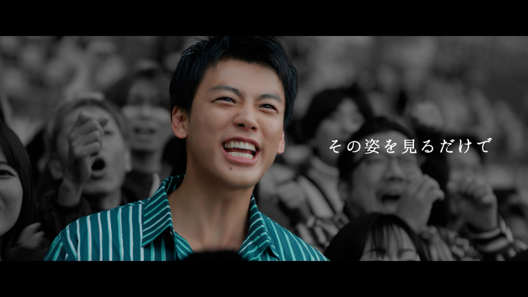 数々の名レースを捉えた迫力の映像と興奮の実況とともに映し出されるのは、競馬場の客席でレースを観戦する長澤まさみ、見上愛、佐々木蔵之介、竹内涼真の4人の姿。祈るようにレースの行方を見守る長澤、うっすら涙を浮かべる見上、体に力が入り内側から震えている佐々木、雄叫びを上げながら熱狂する竹内と四者四様の姿を見せる。