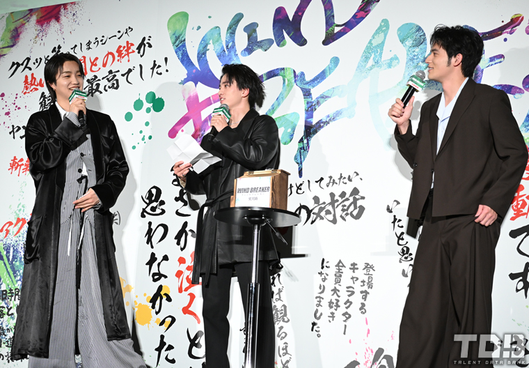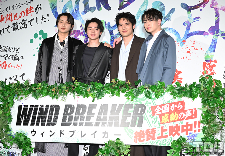 この日のイベントには街を守る正義の不良軍団<防風鈴>より主演の水上、木戸、綱、JUNON(BE:FIRST)が登場。東京でのイベント前に全国の劇場装飾キャンペーンで見事ナンバーワンに輝いた劇場「MOVIX仙台」での舞台挨拶にも登壇してきた水上は「熱かったですね!平日の昼間からすごいたくさんの方々にお越しいただいてすごく嬉しかった」と笑顔をみせるも、滞在時間が4時間半と短ったそうで「ほとんど記憶がございません」と会場を笑わせる。さらにファンだけに留まらず劇場スタッフからの熱気も凄かったという水上は「地方で舞台挨拶をした時に『ようこそ○○』みたいなことをよく劇場のスタッフさんがやってくださるじゃないですか、それは決して公になっていくものではないのであくまで僕らに対するものでしかないってものが素晴らしかったですし、お出迎えがあったんですよ!スタッフの方々が到着してすぐ『わー!』みたいな。ミニグリーンカーペットができててびっくりしました」と劇場スタッフからの歓迎の温かさに感謝を述べた。