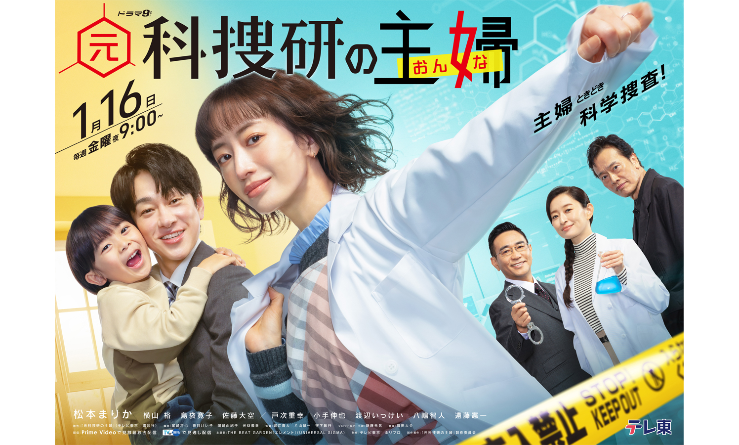 この度、本作のメインビジュアルが完成。エプロン姿の詩織が白衣を身にまとう、その一瞬を切り取った印象的なビジュアルとなっている。左には温かな日常を象徴する吉岡家、右には警察・科捜研のメンバーが並び、主婦としての顔と、科学捜査に挑む研究者としての顔――ふたつの世界が対比的に描かれている。「主婦ときどき科学捜査!」というキャッチコピーの通り、家事や育児の傍ら、事件解決に立ち向かう詩織の姿が鮮やかに表現されている。