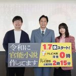 徳井は「今は割といろんなものの境界線がすごく難しくなっていて、笑えるもの、笑えないものや、コンプラ的にアウトとセーフの境界や、官能小説なのか、ただのエログロなのかという境界線がいろいろ難しい中ですが、そういうのを楽しく考えながら見てもらえたりするのかなと思います。非常に見やすい作品なのでとりあえずぜひ1話見てみてください」、そして桃月は「撮影中の合間に官能小説を読んでみたら意外と面白いんですよ、実は。このドラマをきっかけに少しでも官能小説に興味を持ってくれたら、官能小説界隈が盛り上がるかもしれないし、シーズン2とかできたらいいな、なんて勝手に思っています。ぜひ皆さんで盛り上げていただけたらと思います」と三者三様に今夜の放送をアピールした。