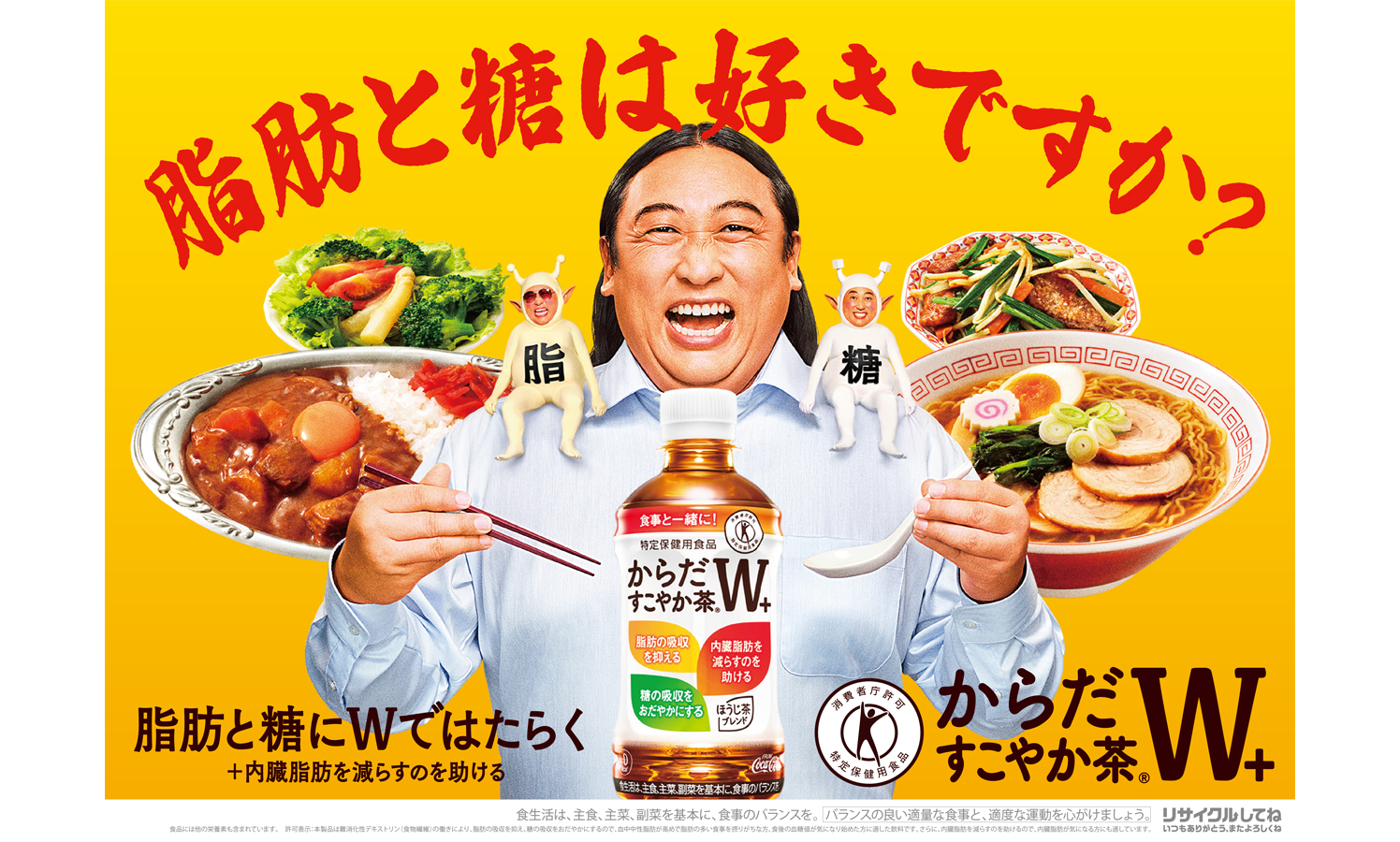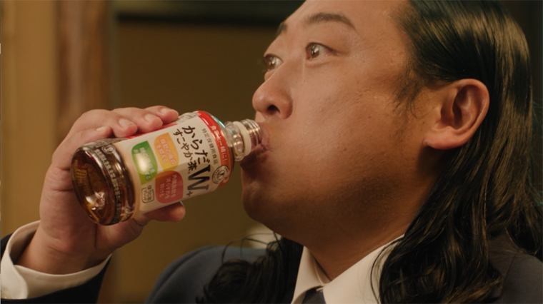 このたびブランドアンバサダーとして、グルメ好きでも知られているお笑いトリオのロバート秋山竜次を初起用。「からだすこやか茶W+」とともに様々な食事に入っている脂肪と糖と楽しく付き合っていこうということを秋山が表現していく。新CM『小悪魔W』篇では、グルメなサラリーマンとその目の前に出現した「脂」と「糖」の“2体の小悪魔”という不思議な一人三役を見事に演じ分ける秋山に注目。