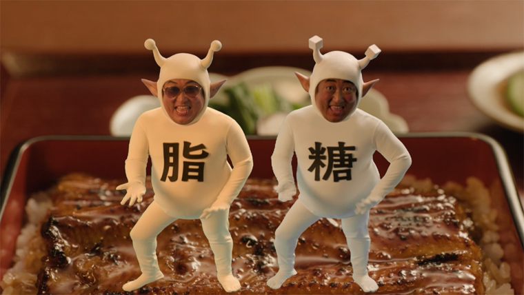 仕事帰りに馴染みの鰻屋を訪れたサラリーマン秋山。ワクワクしながらうな重の蓋を開けると、目の前に2体の小悪魔が出現する。かわいらしい赤ちゃん声でまとわりついたり、ダンスをしたりとお茶目に存在をアピールしてくる小悪魔たち。最初は困惑する秋山も次第にデレデレに。小悪魔2体にすっかり魅了されていく様子が描かれている。「からだすこやか茶W+」を手に、秋山本人曰く「人類で一番美味しそうな顔」でうな重を頬張る秋山のグルメ愛全開の表情にも注目。