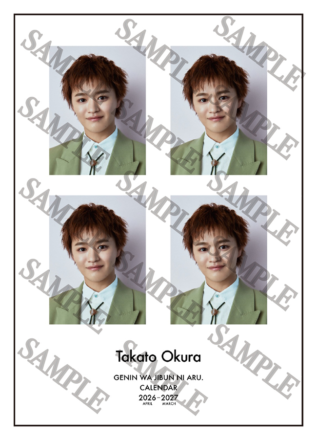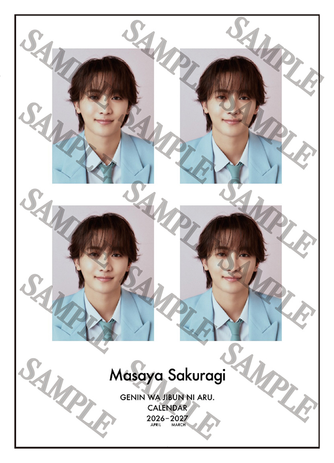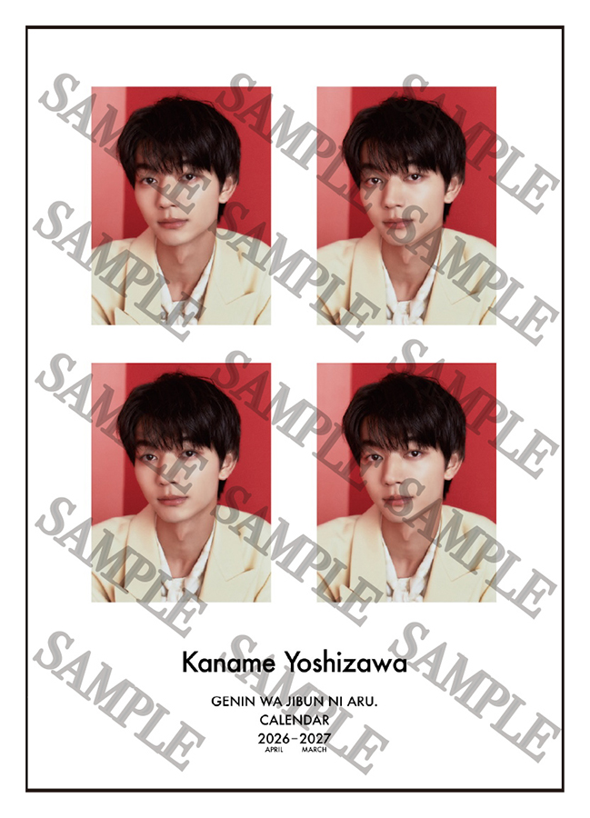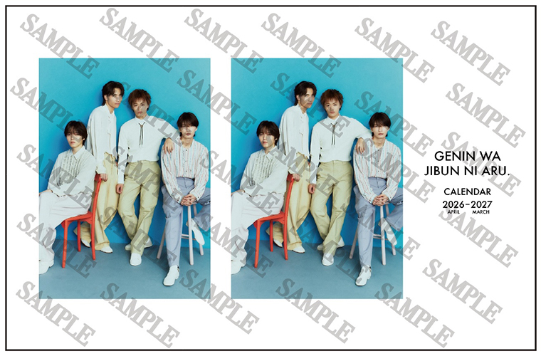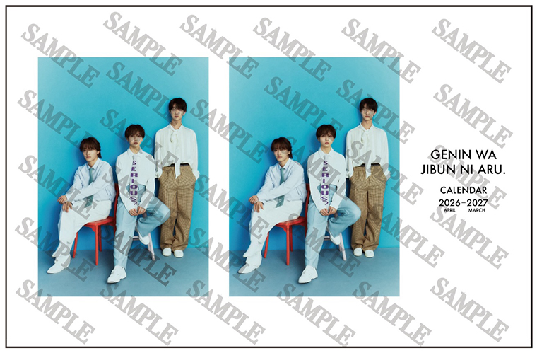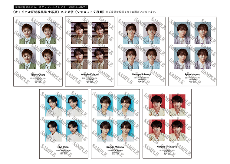 特典カットの生写真は、証明写真風の4カットで構成されたソロビジュアル7種とグループ集合カット、3ショット、4ショットの全10種。7人の今だけの表情を閉じ込めた『原因は自分にある。カレンダー2026.4-2027.3』に注目。