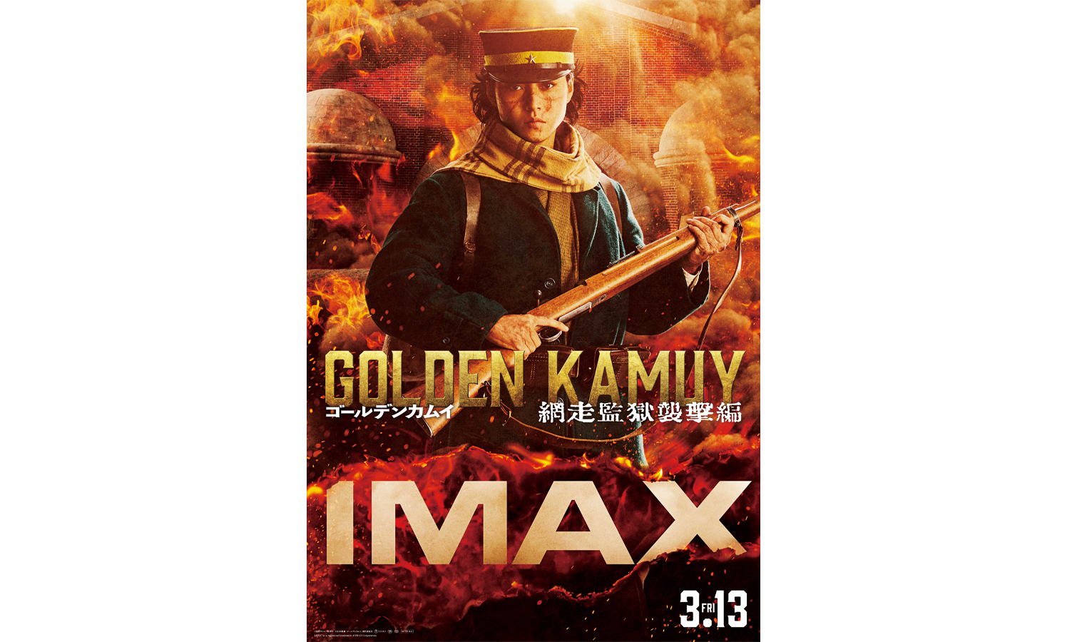 そんな IMAX🄬のポスタービジュアルがついに解禁ッ!今回の舞台である激しく燃えたぎる網走監獄を背に、正面を見据える杉元の姿。彼の目に映るのはいったい…?今作の魅力を最大限に研ぎ澄ました、大迫力なビジュアルに仕上がった!