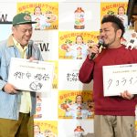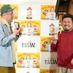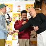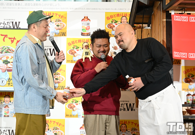 この日のイベントは同日に実施される一般向けサンプリングイベントに先駆けて開催。会場には楽しい食事を象徴する夜鳴きラーメン屋台のセットを前にくっきー!、良ちゃん、金ちゃんが店主と常連客に扮して登場した。威厳のある寡黙な店主に扮した良ちゃんがあいさつするとくっきー!が「声だいぶ小っちゃいぞ!」とツッコみ登場から会場の笑いをさそって盛り上げる。また肩にブランドアンバサダーを務めているロバートの秋山竜次を乗せた衣装の金ちゃんは「控え室で『似合ってるな~』って絶賛です!」とにっこり、あまりにも似合いすぎてるその姿にくっきー!は「高須んとこいってこういう骨の加工してもうたら?」と大胆な提案で笑わせる。