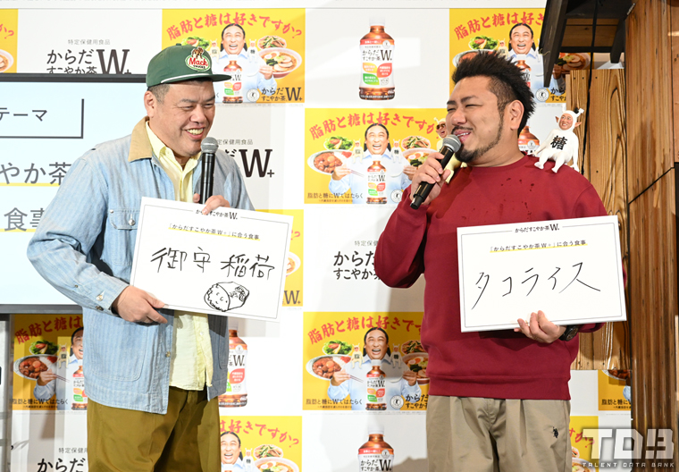 また本商品に合わせたい食事という質問にトップバッターで回答したくっきー!は「御守稲荷」と未知の食事を挙げ「中身抜いて米詰めたら体もスッキリして精神もスッキリして嫌なもの取っ払ってすごいピカピカなる」と説明すると、金ちゃんは「1発目に飛ばすのやめてください」と苦笑い。くっきー!は「だからなんで1発目にしたん?」とMCに問いかけ「ぼくの芸風知らん?」と詰め寄って笑わせていた。