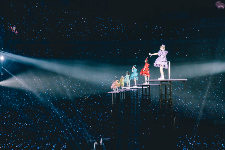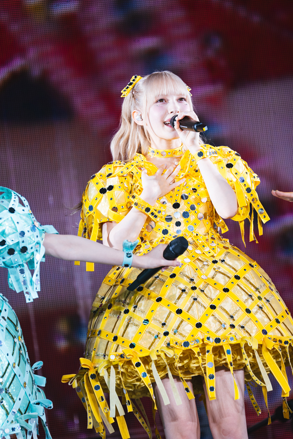 会場に集まった約5万人のファンへ改めて自己紹介を届けたのち、「ぴゅあいんざわーるど」から「はちゃめちゃわちゃライフ!」「KawaiiってMagic」へとテンポよく展開。そこへCAPSULEのカバー曲「Sugarless GiRL」を重ね、序盤の熱量を決定づけていった。続いて、メドレー形式で「ハートのローラーコースター」「キミコイ」「ずっと、ずっと、ずっと!」「skyfeelan」「ふれふるサマー!」をテンポよくつなぎ、表情の異なる楽曲を次々と繰り出していく。東京ドームの広さを感じさせないほど、曲ごとの盛り上がりが客席全体に伝播し、会場は早くも一体感に包まれていった。