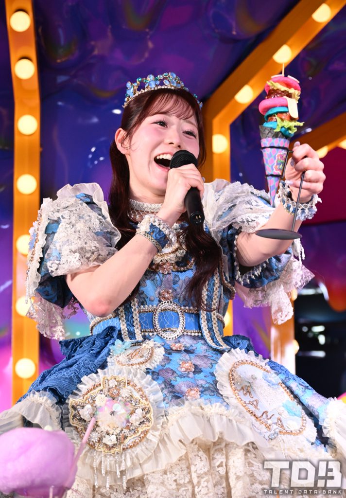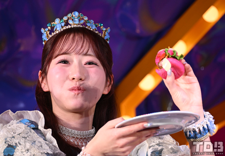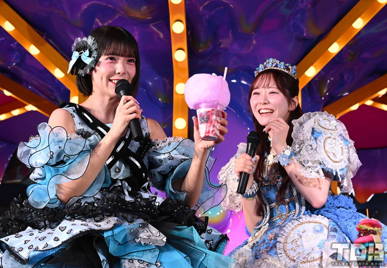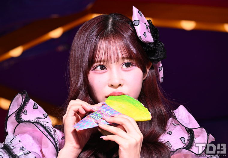 そんな後輩2人からバトンが回ってきた真中は「やばいいま東京ドームより全然緊張してる」と苦笑いしつつ、覚悟を決めた様子で息を整え「じゃーん!見てください!このカラフルなバーガー!」とカラフルポップバーガーを全力でアピール。ハンバーガーを手に持った真中だったがどうやって食べればいいかわからず「え、どこから食べよう、待ってどうしようどうしよう!なんか全部試されてる」とつぶやき会場は爆笑。豪快に頬張った真中は「めっちゃ普通にめちゃくちゃ美味しいです!色から想像できないぐらいちゃんと美味しいハンバーガーの味がします。めちゃくちゃご飯です、甘さはないです」と驚きで目を丸くして「チーズとトマトとレタスとお肉とすごくソースついてて本格的なバーガーの味。2個ついてるのでシェアハピしても楽しいのかなと思います。いろんなもの頼んで、なんかみんなでワイワイ食べてもらえたらすごく素敵だなと思いました」と見事な食レポを披露していた。
