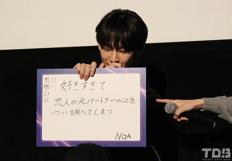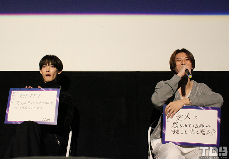 そして、最後のNOAはフリップを見せる前から暗い表情を浮かべ、披露したのは「好きすぎて恋人の元パートナーのことをつい調べてしまう」。この答えも「ええ…」と観客に引いてしまい、「相手の過去が気になってしまうのがベースにあるんですけど、自分じゃないどんな人が好きだったんだろうと、過去のその人たちと自分を比べちゃう…」と理由を話すもどんどんトーンダウン。「自分からはどんな人と付き合ってたのか聞けないので、自分で調べるんでしょうね」と続けるとさらに悲鳴があがり、「どうしよう〜」と顔を見合わせるNOAと阿久根。