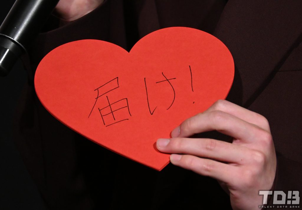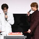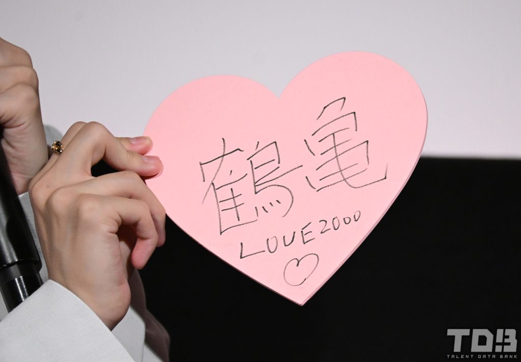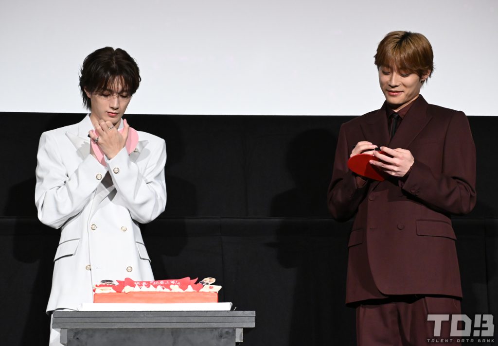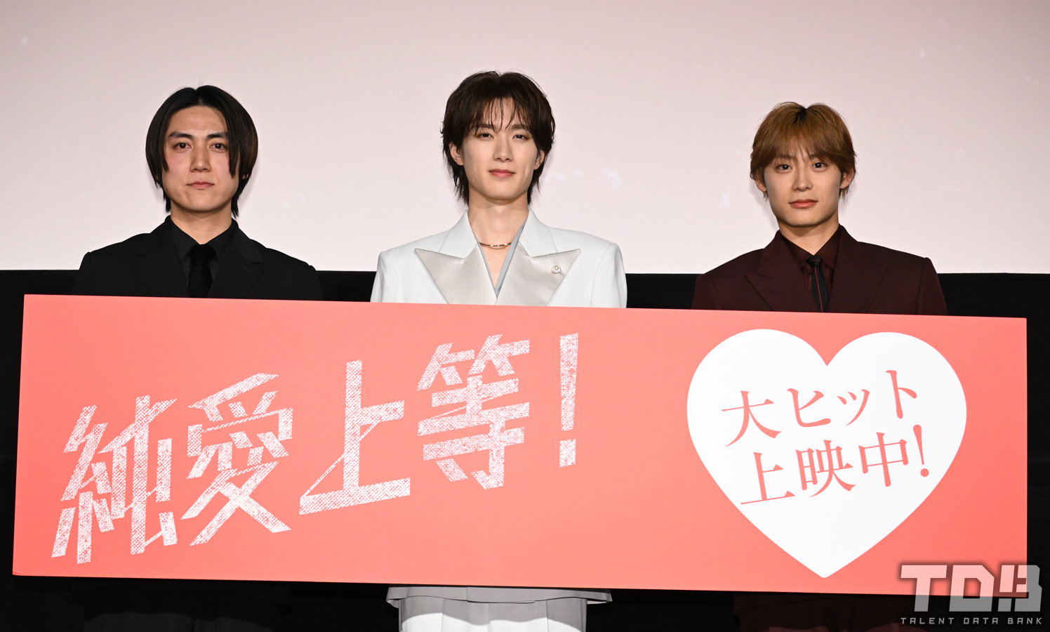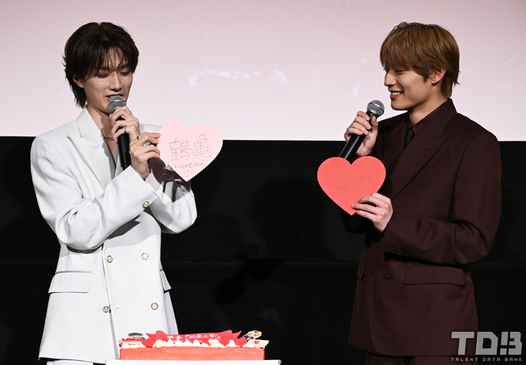 この日の舞台挨拶は2月14日のバレンタイン当日ということで、会場には本作のタイトルにかけ究極の“純愛”ケーキが登場し、ケーキを主演の2人が仕上げのデコレーションを行うことに。ケーキに添えられたハートプレートへバレンタインにちなんだ一言を書き込む2人、山中は「鶴亀LOVE2000」と書いて披露すると、髙松は「鶴亀かけるようになってる」とぽつり。「鶴亀書けなかったので今日はちゃんと勉強してきましたってアピールも込めて」と照れながら書いた理由を明かす。髙松は「届け!」と書き込んだプレートを掲げ「全国の皆さんに『純愛上等!』という作品を届けたいなという気持ちもありますし、バレンタインなのでこの中にもしかしたら好きな人にチョコを渡す人もいると思うので、隠さず直接渡してもらえたらいいなって思います」とバレンタインにチョコを渡す人へエールを送った。その後仕上げとしてハートのプレートを2人仲良くケーキに差し込んでデコレーションを楽しんでいた。