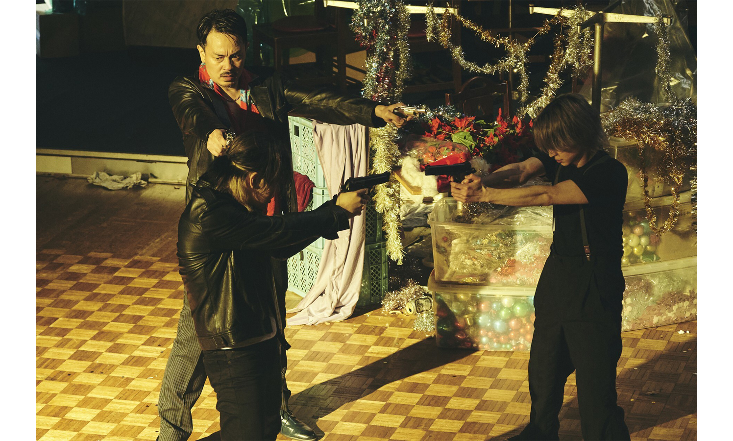 今回、解禁となったのは、後に一致団結してダンスを披露することになるとは到底思えない、殺気に満ちた殺し屋3人が集結し顔を合わせる、不穏な雰囲気漂う冒頭シーンの一部。熊城の号令の元、そこにまず集まったのは、桐生とシン。フリーの殺し屋として名を馳せてきた彼らは、言わば商売敵。会話もそこそこにすぐさま互いに銃口を向ける、緊張が走る場面となっている。そこに登場するのが、シルバーの髪と左頬に傷を持った伝説の元殺し屋・ダイヤ。「殺しはもう引退してる……」そう言い放つダイヤを他所に、すぐさま3人での激しい銃撃戦が勃発。2丁の拳銃を使いこなすシン、ダイヤと桐生による超至近距離での銃撃アクションが繰り広げられる中、3人が足を止め、次に引き金を引くのは誰か――と息をのんだ瞬間。廃墟に突如鳴り響いたのは……松本伊代の「センチメンタル・ジャーニー」。熊城のスマホから鳴り響いた、昭和の鉄板アイドルソングによって、その場の空気は一変。これから殺し屋たちに待っている、“ダンスとの格闘”の日々を予感させる一幕となっている。