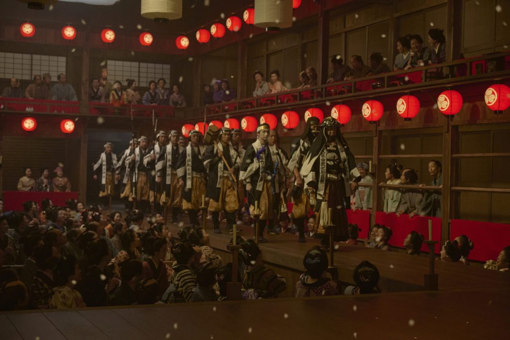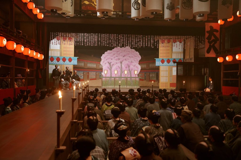 本作の大きな見どころの一つが、森田座での江戸歌舞伎の様子を芝居小屋ごと丸ごと再現しているリアリティ。300人もの客が座って観劇できる規模の劇場が東映京都撮影所のスタジオ内にすっぽりと組まれ、舞台と客席の境目のない、江戸歌舞伎ならではの臨場感がスクリーンによみがえっている。江戸歌舞伎考証を手がけた石橋健一郎によれば「庶民にほとんど休日のなかった時代、芝居見物は年に一度か二度の大きな贅沢でした。何日も前からどの着物を着ようか考え、心を躍らせて小屋へ向かう。その高揚感は今とはまったく違ったはずです。舞台と客席の距離も近く、大入りの時には舞台の袖にも客を座らせたことがあったそうです。文字通り、一体感のある空間でした」と話す。さらに渡辺謙も完成披露舞台挨拶で、再現されたセットについて「江戸の歌舞伎はこうだったのだと実感できる劇場でした。袖や楽屋、小道具部屋まできちんと作られていた」と語り、客席を埋めた観客も当時の扮装で臨んでいたことに触れ、「あの空間に立つと、自然と入り込めた」と没入感の高さを明かしている。