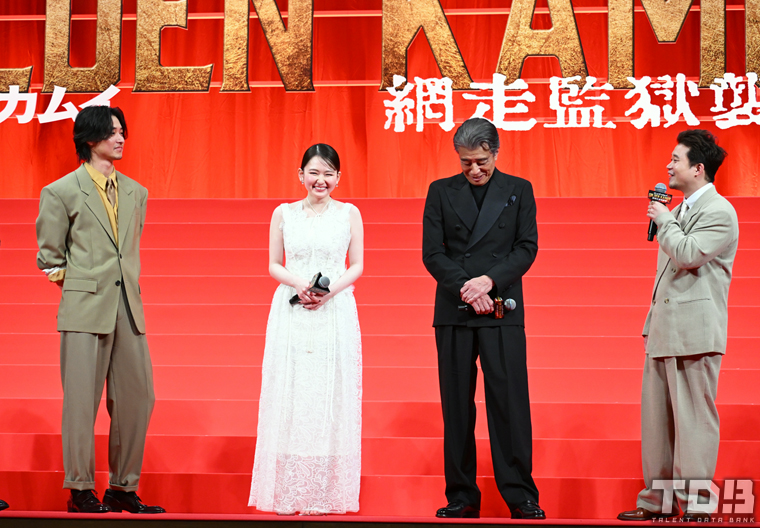 赤く燃え上がる炎の階段より大勢の観客から大きな歓声を浴びながら登場した山田は「前作、そしてドラマシリーズに引き続き、こうしてアシㇼパを再び演じることができてとても嬉しく思っております。出来上がった本編とても面白かったです。皆さんにも楽しんでいただけるといいなと思います」とにっこり。