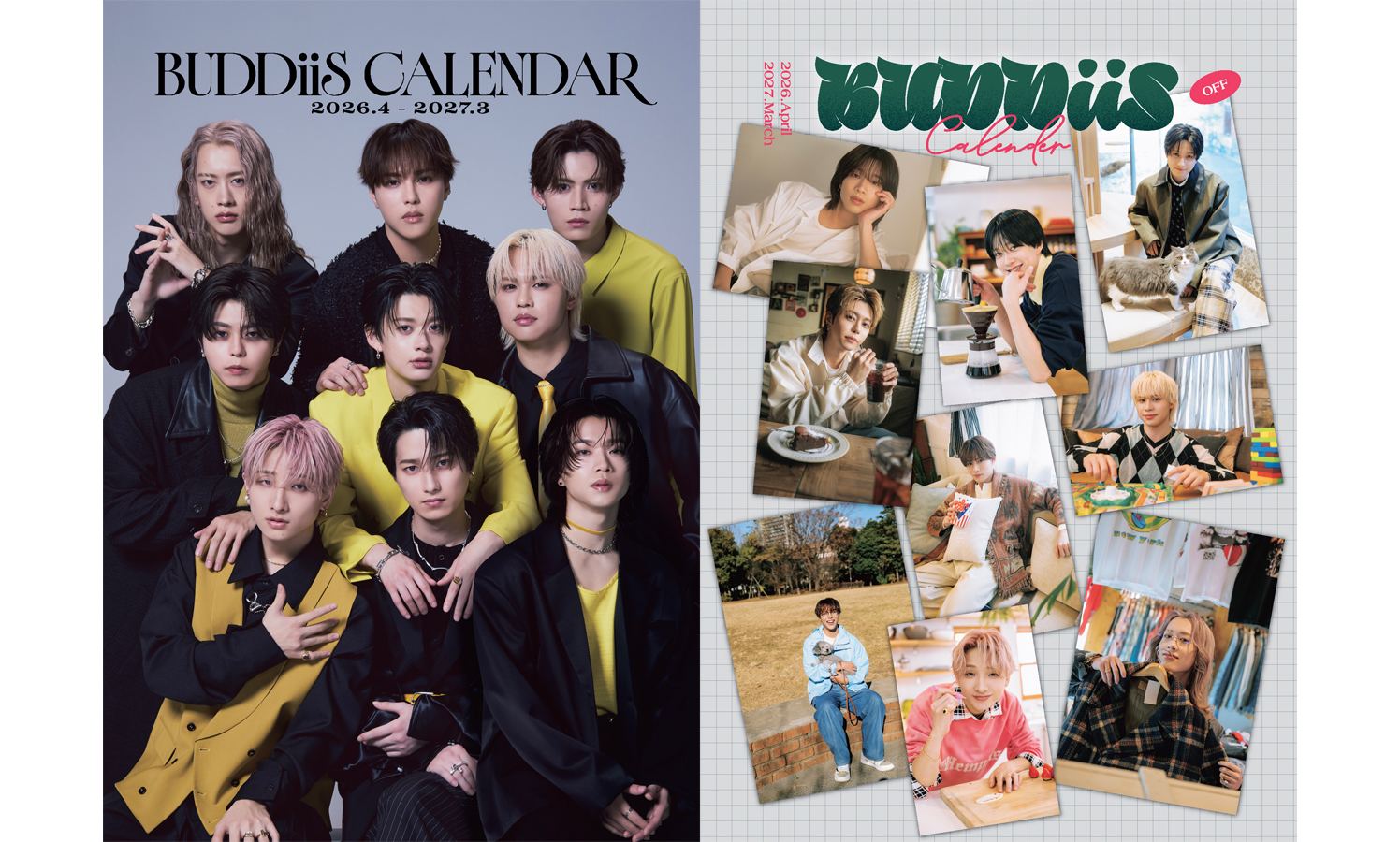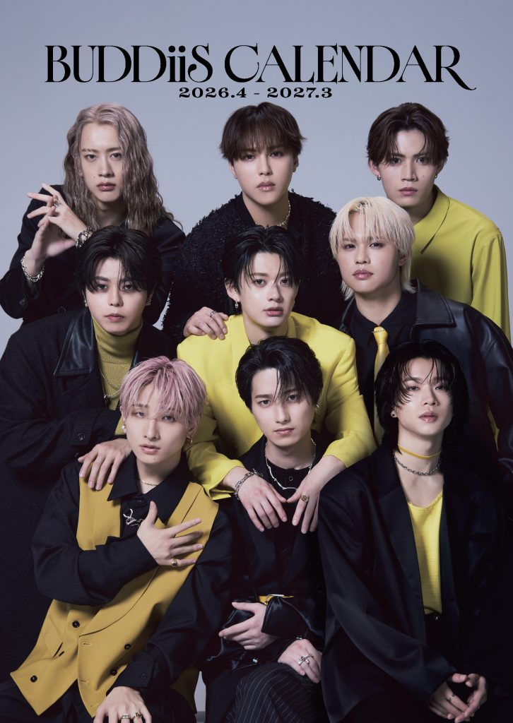 今作は、両面印刷仕様の豪華なカレンダーをコンセプト別に展開。アーティストとしての格好良さを全面に押し出した「ON」と、甘い表情が満載の「OFF」。対照的な2冊を揃えることで、BUDDiiSの振り幅とギャップを存分に楽しめる内容となっている。「ON」をテーマにした一冊では、イエロー×ブラックのフォーマルな衣装に身を包み、シックで洗練された佇まいを披露。衣装の黒に、グループカラーであるイエローが視線を惹きつける印象的なビジュアルに仕上がっている。クールにキメる9人の集合カットも本作を象徴する見どころのひとつ。一方、「OFF」はメンバーそれぞれが考案した“バディにしてあげたいこと”を再現したソロカットで構成。わんちゃんとのお散歩デートや手作りケーキ、カフェや部屋でくつろぐワンシーンなど、恋人距離を感じさせる甘いシチュエーションが満載。9人それぞれの個性や素顔に、より近い距離で触れられる一冊に仕上がっている。グループとしての凛々しさと、メンバー個々が持つ柔らかな魅力。相反する2つのコンセプトを通して、BUDDiiSという存在を「グループ」と「個人」の両面から見つめることができる今作のカレンダー。“今”の彼らを詰め込んだ、特別な二冊となっている。