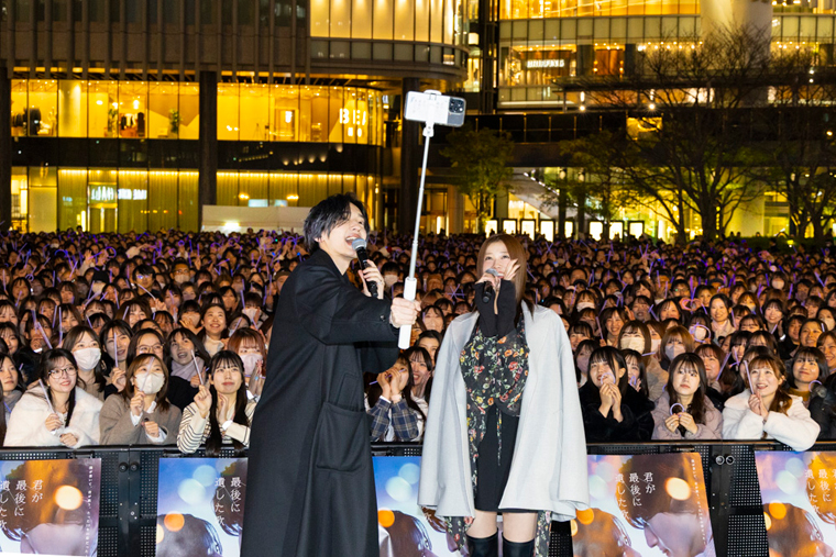 最後に、これから映画を楽しみにしている皆様に向けて「この作品は、人を想う気持ちや支えるその気持ちがすごく大事なんだと気づかせてくれる作品だと思います。大事な人と観に来ていただけたら嬉しいです。そして周りの方々に感想をお伝えして、SNSにもどんどん感想も呟いていただけたらいいなと思っているので、みんなで一緒にこの作品を盛り上げていけたらと思います!ぜひ劇場でご覧ください。よろしくお願いいたします。」「個人的には、この綾音という役に出会えて本当に良かったと心から思います。今できる全力を注ぎ込んだ作品です。最後まで見ていただけるときっと、『君が最後に遺した歌』というタイトルでこういうことが伝えたかった、遺したかったんだなっていうのが分かると思います。ぜひ大切な方と、劇場に足を運んでください。よろしくお願いします。」と挨拶をし、会場に集まった約3500人のお客様と一緒にフォトセッション。さらに道枝が音頭を取り、会場いっぱいのお客様と自撮り記念撮影も!会場お客様は青いサイリウムを掲げて星空に見立てたフォトセッションで、約3500もの星空の真ん中で、春人と綾音を演じた道枝・生見の二人が、「スピカ」と「アルクトゥルス」のような、この春一番の輝きを放っていた。