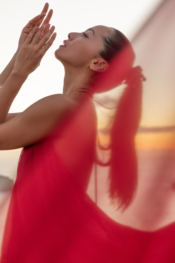そして今回はこれまで見せることがなかったアクティブな一面も初公開。サーフィンを楽しむ姿や、海中でイルカと戯れるスキンダイビングシーンは圧巻。まるで人魚のように自由に泳ぐ彼女の姿に、カメラマンのシャッターが止まらず、最終的に撮影カット数は約1万カット以上に。
