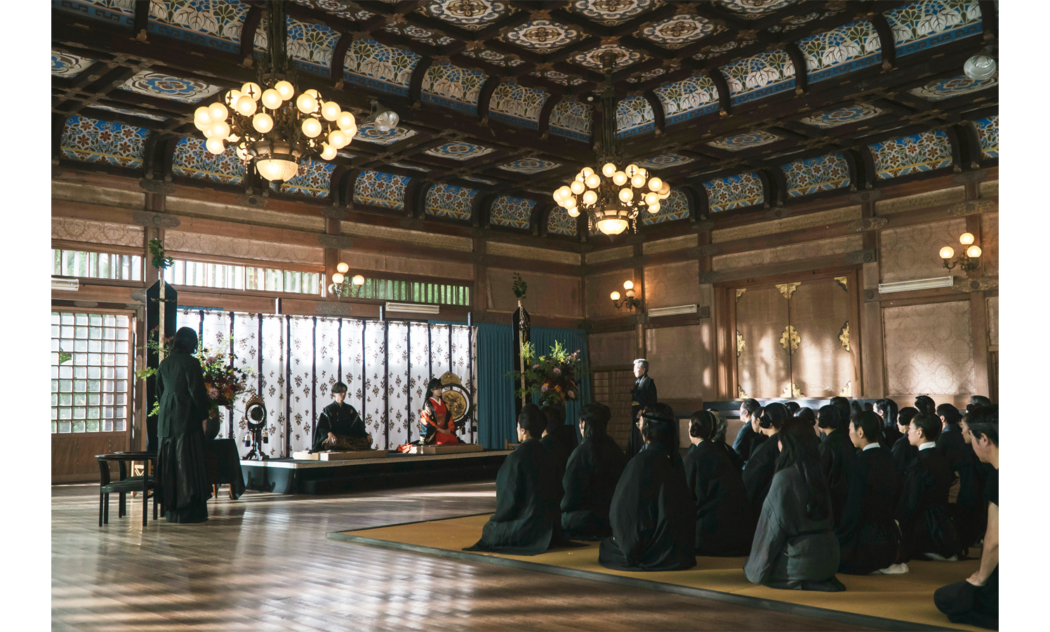 大勢の使用人たちを前に、並んで座る玲夜(永瀬 廉)と柚子(吉川 愛)。一族の次期当主に相応しい力強い声で玲夜が「花嫁の柚子だ。今日からここで暮らすことになる」と宣言。一族繁栄の希望である柚子に対し、使用人たちは一斉に平伏する。その光景に圧倒されながらも、柚子が「よろしくお願いします」と、凛とした表情を見せる。緊張しながらも、玲夜に応えようとする柚子の横顔を、玲夜が愛おしそうに見つめている。そして2人の視線が重なる瞬間は、まさにここから手を取り合って生きていく約束を交わしたかのよう。これから待ち受ける覚悟の日々に、誰もが祝福を送りたくなるような晴れやかで厳かな幕開けのシーンとなっている。