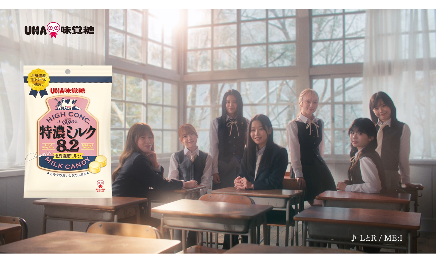 新CMは、ME:Iのメンバーたちが過ごす何気ない放課後の時間が、「特濃ミルク」によって特別な思い出へと変わっていく様子を3篇のショートストーリー形式で描かれる。「特濃メイト 特濃ミルク」篇にAYANE、SUZU、TSUZUMI。「特濃メイト 塩ミルク」篇にKEIKO、RINON。「特濃メイト もも」篇にMIU、MOMONAがそれぞれ出演。あっという間に過ぎ去っていく日常も、全力で生きる“今この瞬間”も、「特濃ミルク」があれば、”今日にしおりをはさむように“やさしく・ゆっくりと思い出になっていく。大切な仲間との愛おしい時間が心や記憶に浸透していく感覚を、やさしく溶ける「特濃ミルク」の味わいになぞらえ、新CMのキャッチコピー「今がやさしく溶けてゆく。」に込められており、CMソングには、恋をしている気持ちをイヤホンのLとRに例えた歌詞が特徴的なME:Iの楽曲「LとR」が使用されている。