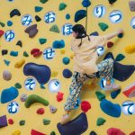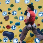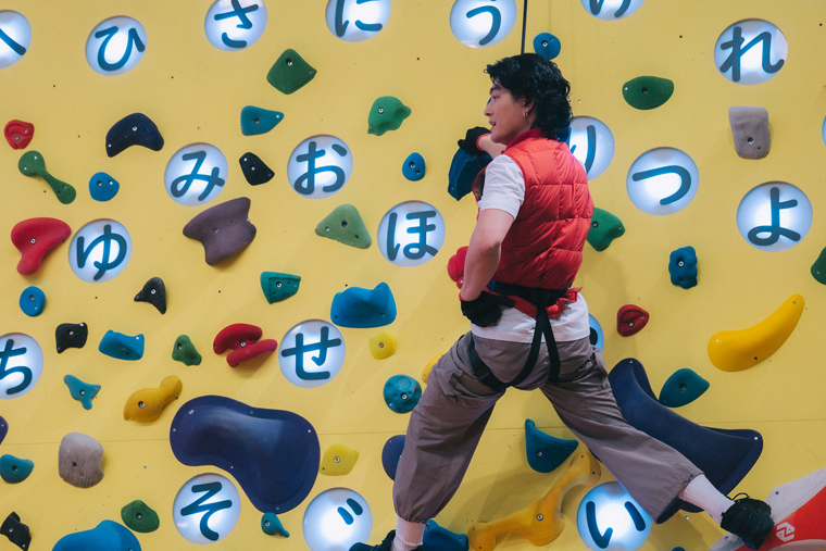 チームメンバーが描いた絵の名前を、壁に散らばった五十音のボタンを押して答えるクライミングクイズゲーム。