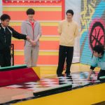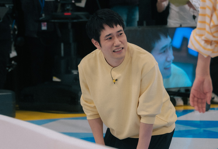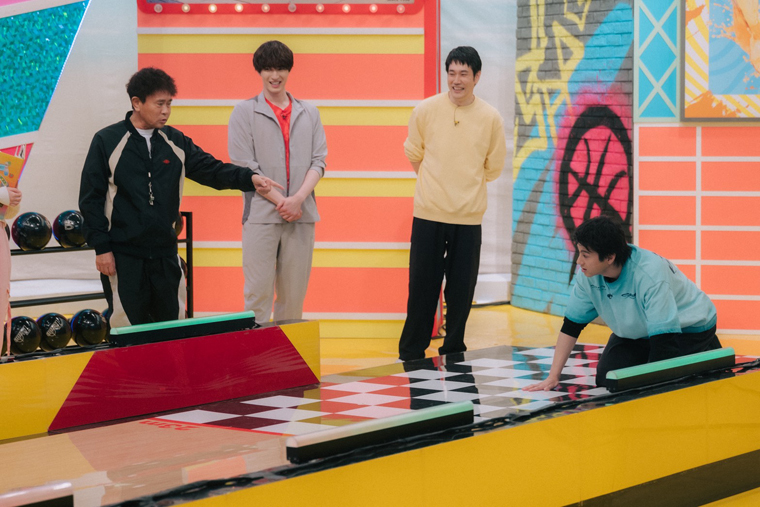 ピンの色が3色コロコロと変わる中、自チームの色に変わる瞬間に合わせて倒すことが求められるタイミングボウリングゲーム。大量得点が期待されるゲームの中、山田がまさかのハプニングで土下座の爆笑展開に。