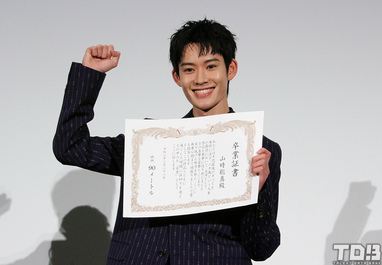 卒業証書を手に、山時は「この『90メートル』に出会って、菅野山谷西野さん、監督とも出会って、毎日素敵な時間を過ごさせていただきました。試写が終わった後に、皆でご飯を食べに行ったんです。その時に誕生日プレゼントをもらったりしながら、なんて幸せな日なんだっていう気持ちでいっぱいで、いつになっても忘れられない時間だなと思います」と述べる。